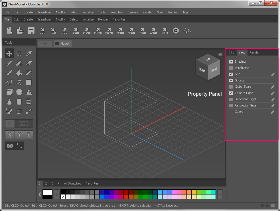 The other two tabs are listing various display options that you can toggle. By clicking on the pencil icon next to an option you can edit further display settings like watermark text or background colors. The settings made in the View panel affect the Work Area. With the Render tab you can adjust the render to file settings. Once this tab is activated you will see a preview of the render result.